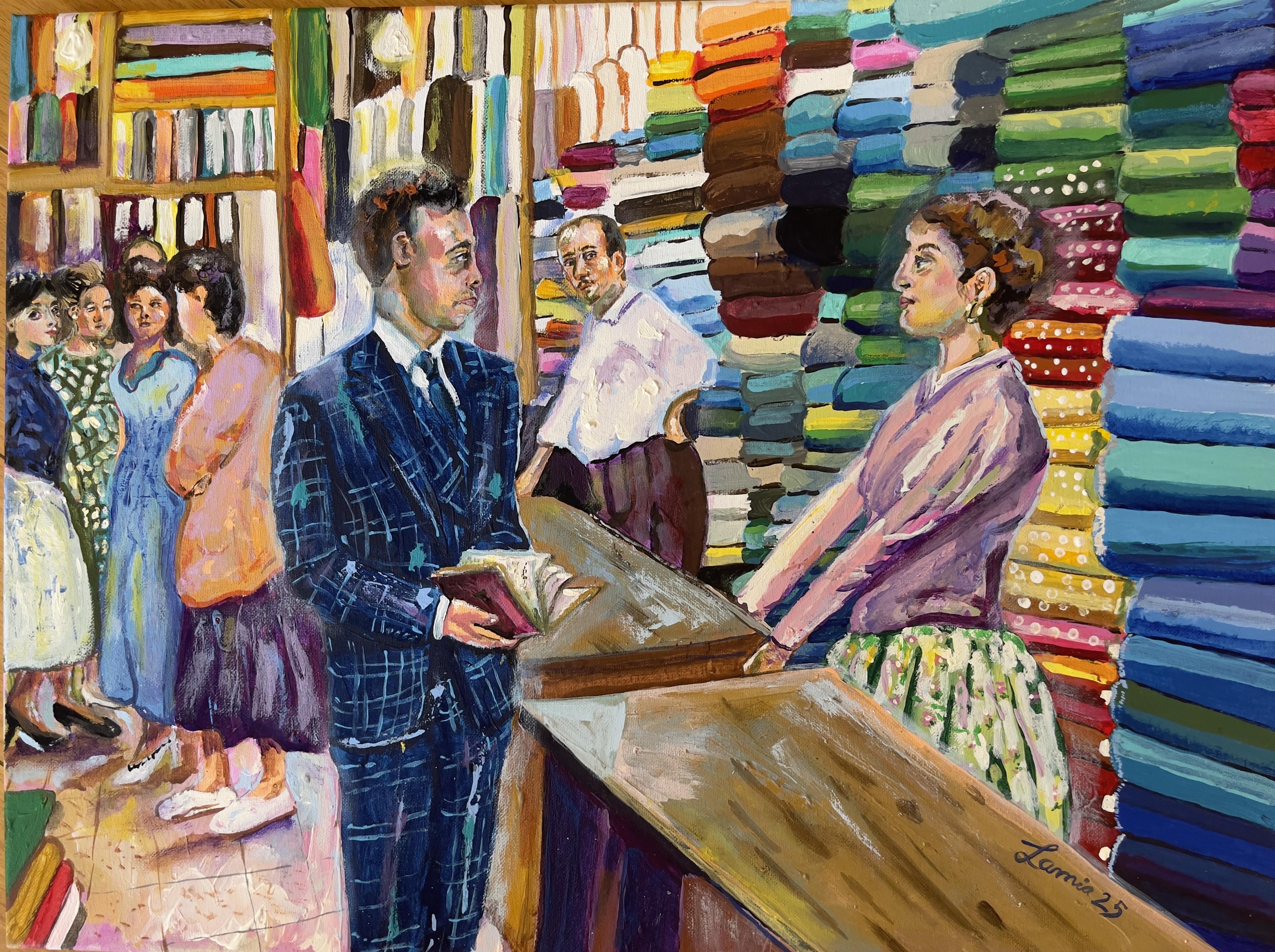 “Beauty of Fabrics” Available Acrylic on Canvas 18″x24″ 2025